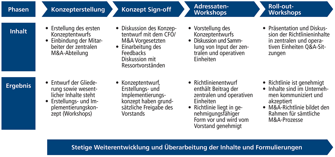 Die Akzeptanz für eine neu einzuführende oder in wesentlichen Teilen zu überarbeitende Richtlinie wird gefördert, wenn den Adressaten der Richtlinie die Möglichkeit gegeben wird, ihre Ideen und Vorstellungen einzubringen. Eine gute M&A-Richtlinie kommt nicht ohne den Beitrag der operativen Einheiten aus. Gerade bei diversifizierten Unternehmen mit unterschiedlichen Geschäftsmodellen ist es unerlässlich, den Besonderheiten der Unternehmenseinheiten Rechnung zu tragen. Dies ist nur möglich durch frühe Einbeziehung von Entscheidungsträgern aus den dezentralen, operativen Einheiten. Abbildung 2 enthält ein Phasenmodell zur Erstellung und Implementierung einer M&A-Richtlinie.